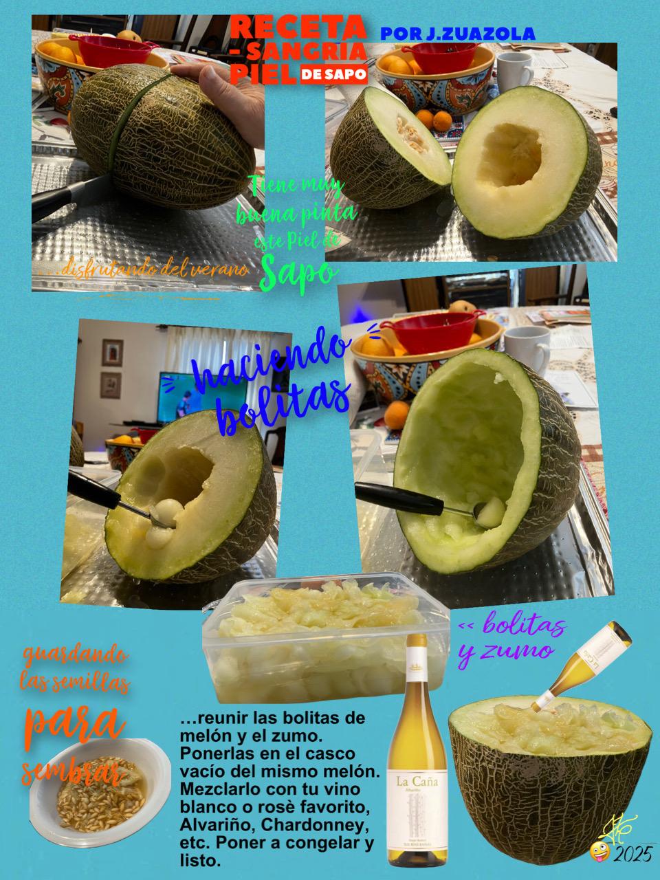 Pinche aquí arriba para una simple receta de melón "piel de sapo" con un toque de su vino blanco favorito. Sacar bolitas del melón guardarlas en su mismo casco con su propio zumo y un toque de vino blanco al gusto. Poner a congelear. Servidlo medio congelado. Refrescante y delicioso.